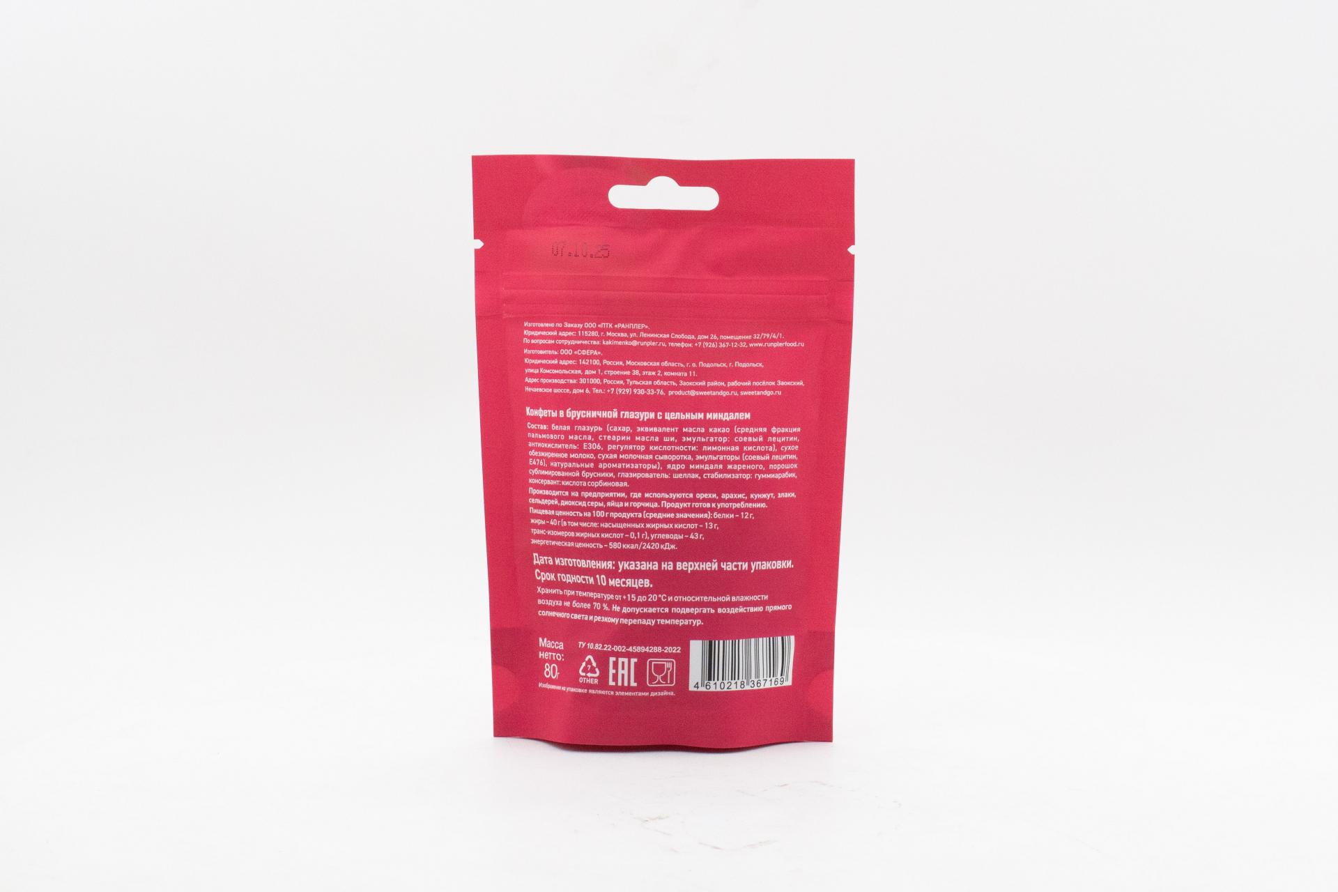 Конфеты Sweet&Go в брусничной глазури с цельным миндалем (Россия) 80г121,28 руб. за штуку (в упак. 15 шт.) |