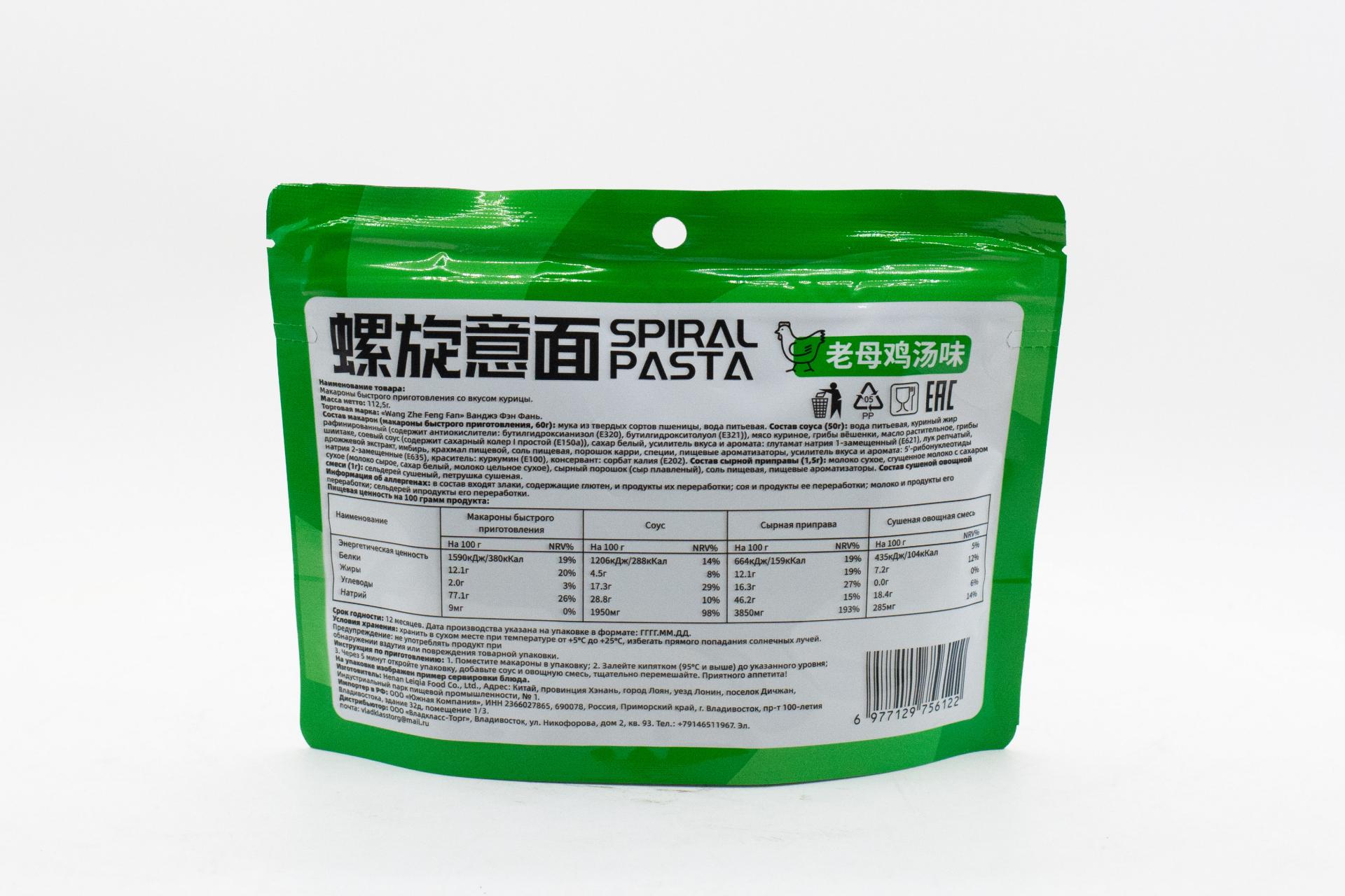 Макароны б/п Ванджэ Фэн Фань со вкусом курицы (Китай) 112,5г103,64 руб. за штуку (в упак. 50 шт.) |